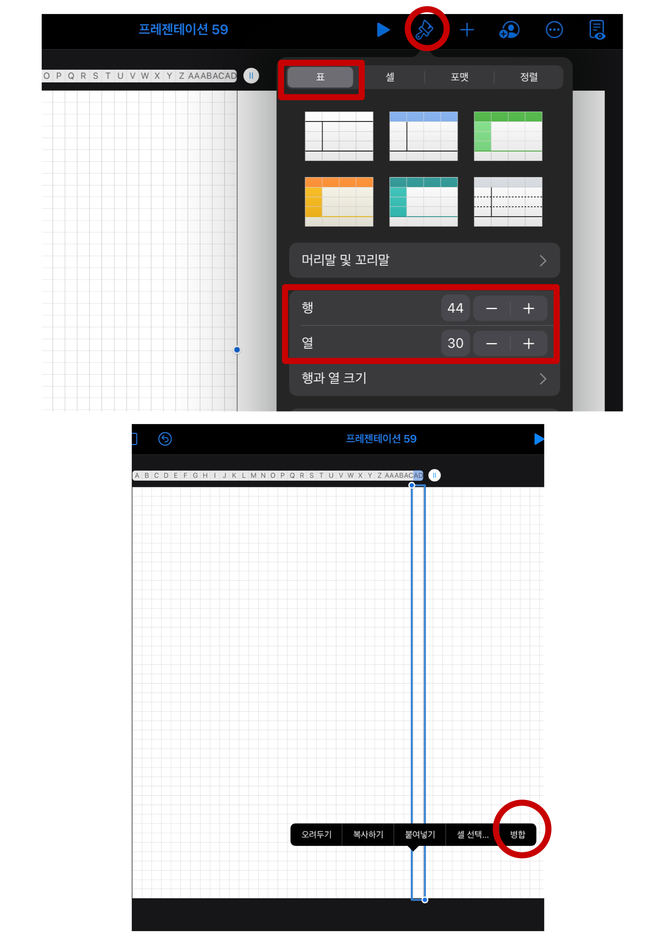 앞에서 했던 것과 마찬가지로 표를 선택하고 표를 반쪽 부분에만 맞춰주세요.(A5용지 크기만큼) 그런 다음 모눈용지로 만들기 위해 행44*열30 으로 변경해주세요. 표를 복사해서 옆쪽에 붙여넣기 해주세요. 저는 개인취행으로 테두리 근처는 비워두고 싶어서 셀병합을 선택해주었어요.
