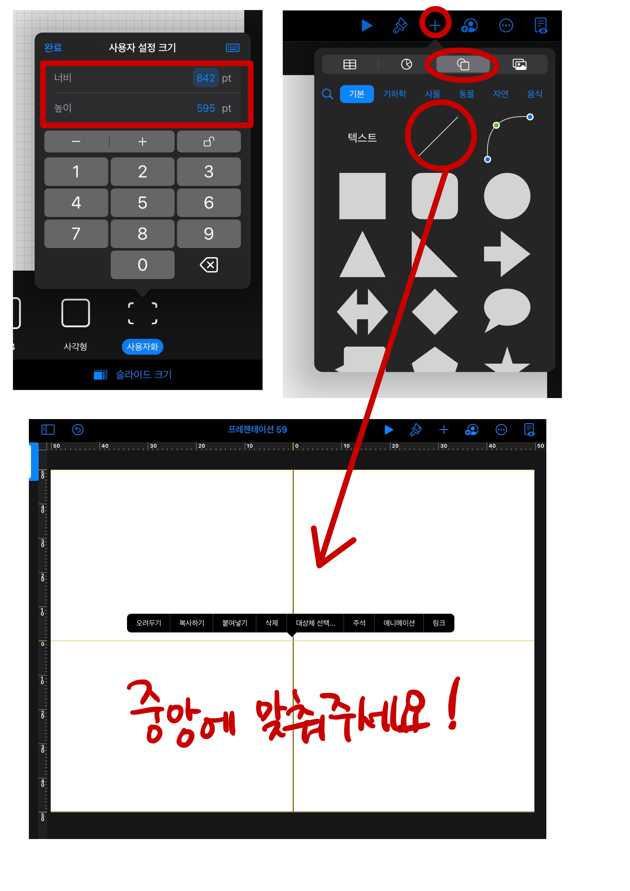 그 다음으로 문서의 크기를 A4용지 크기로 바꿔주세요. 오른쪽 상단의 기타(점 3개 아이콘)를 클릭한 후, 문서설정으로 들어가주세요. 오른쪽 하단의 슬라이드 크기를 선택한 후 사용자화를 눌러주세요. A4용지 세로 사이즈인 595*842 를 입력한 후 완료를 눌러줍니다. 완료를 누르면 화면에 A4용지 세로 크기의 화면이 생성됩니다. 다시 한 번 오른쪽 상단의 완료를 눌러주세요.