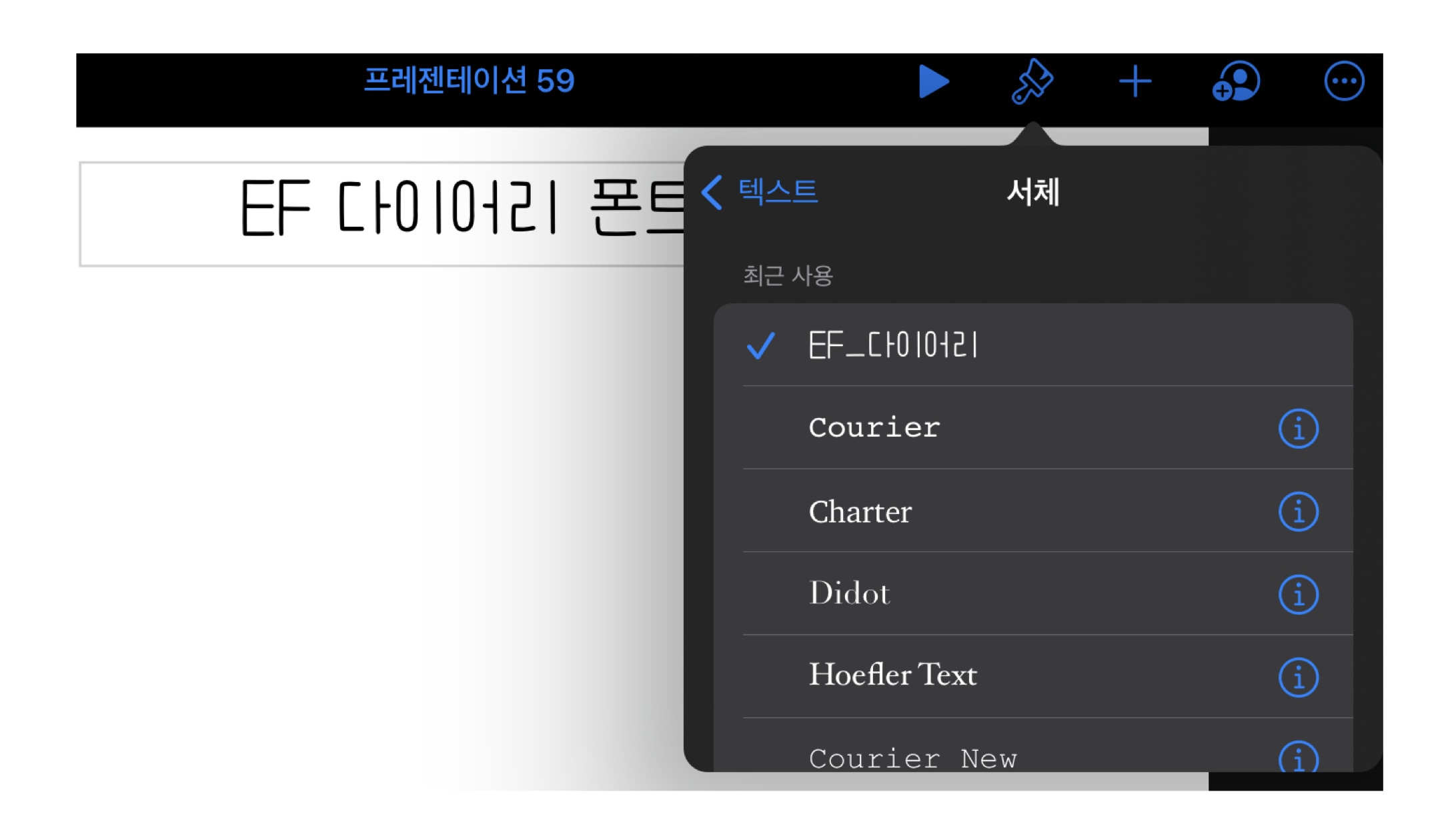원래 사용하려고 했던 굿노트4에서는 한글폰트 변경이 안되서 아쉽지만, 대신 키노트에서 설치가 잘 되었나 확인해봤습니다. 설치도 잘 되었고 설치한 폰트도 마음에 드네요. 전 굿노트가 예전 버전이라 한글폰트 변경이 안되지만, 요즘 사용하는 굿노트는 모두 5이니가 당연히 변경이 가능합니다. 굿노트5 사용하시는 분들은 예쁜 한글폰트 등록하셔서 다양하게 활용해보세요. 이렇게 아이패드에 폰트를 설치해놓으면 노트필기 어플 뿐 아니라 유튜브 제작을 위한 동영상편집 어플에서도 다양하게 활용가능합니다. 모두 아이패드에 예쁜 한글폰트를 설치해 보아요^^