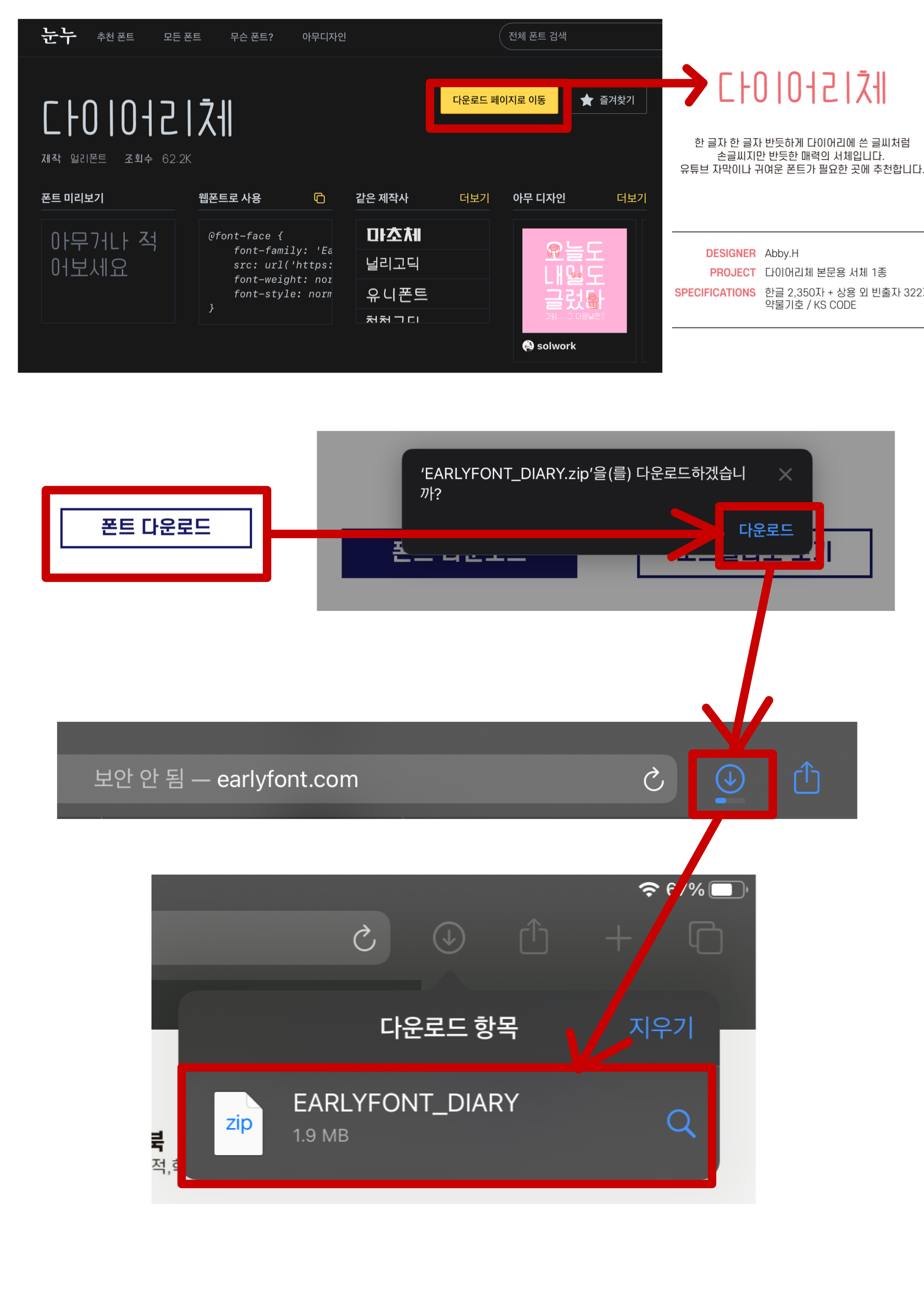 우선 눈누나 다른 폰트 사이트에 들어가 원하는 폰트를 다운로드 받아주세요. 전 눈누 사이트에 들어가 다이어리체를 다운로드 받았습니다. 원하는 글씨체가 있으면 '다운로드 페이지로 이동'을 클릭 한 후, 해당 사이트의 아래쪽으로 스크롤을 내려 '폰트 다운로드'를 눌러주세요. 다운로드 안내창에 있는 다운로드를 누르면 사파리 주소창 오른쪽편에 다운로드 표시가 나타납니다. (동그라미 안에 아래쪽 화살표)