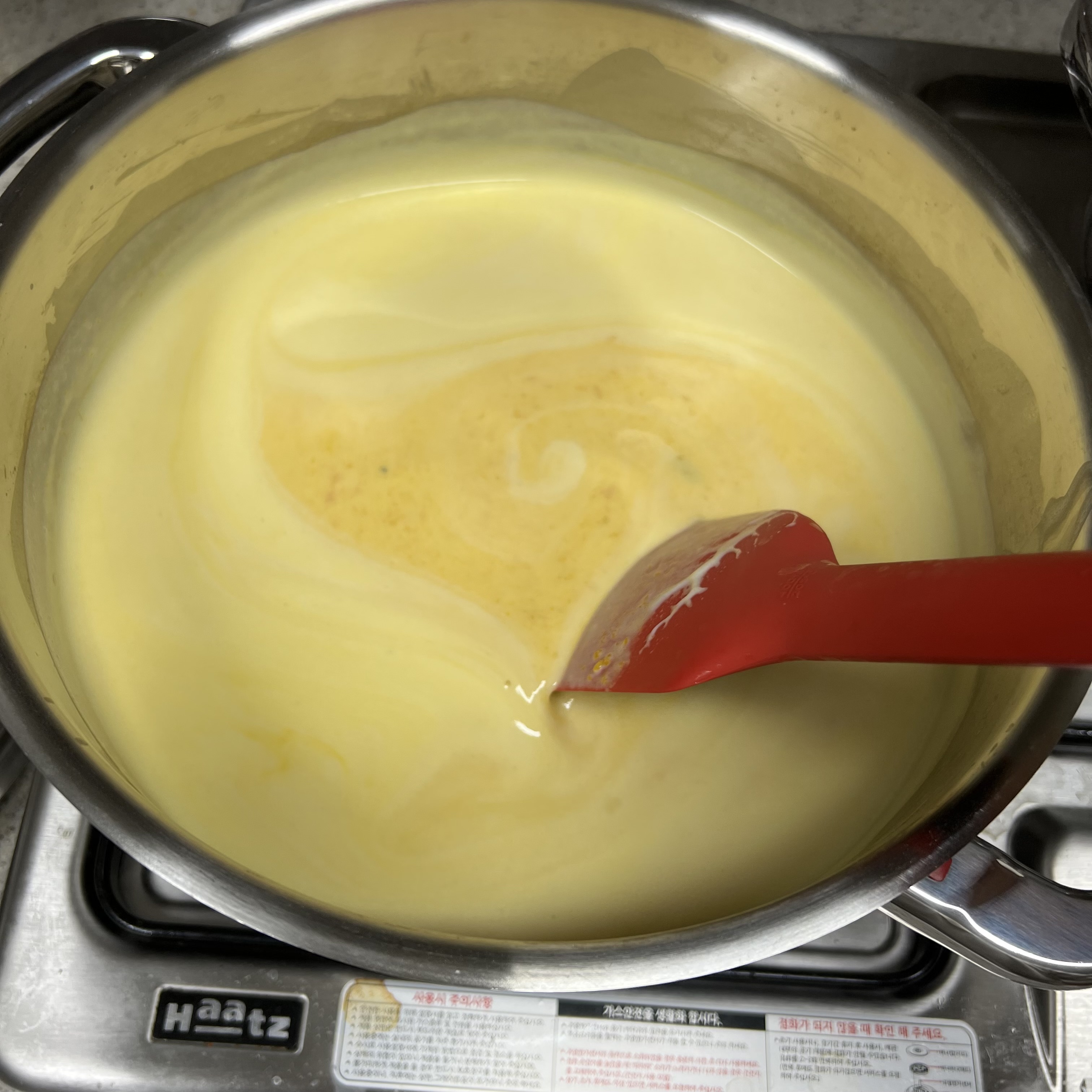 먼저 우유 한 팩(대략 1,000ml)에 한천가루 15g~20g 넣고 가루가 풀리도록 잘 저어주세요. 한천가루가 잘 풀렸다면 곱게 으깬 단호박을 넣고 중불에서 끓여주세요. 우유가 냄비 바닥에 늘어붙지않게 계속 저어가면서 끓여줍니다. 냄비 가장자리가 보글보글 거리고 끓으려고 하기 직전에 불을 끄고 용기에 부어주세요.