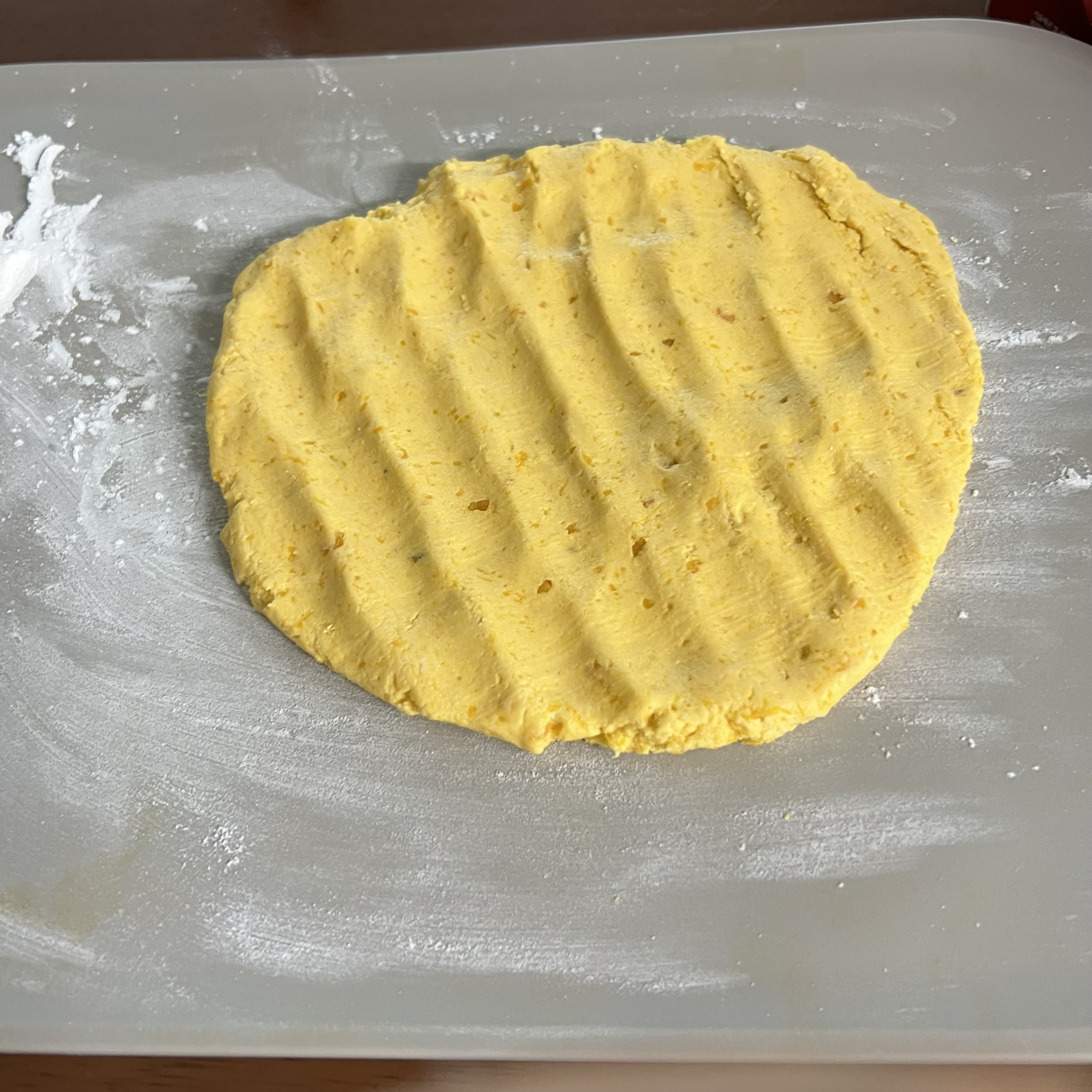 반죽을 얇게 펴 줄 작업대에 (저는 도마를 사용했습니다.) 남은 쌀가루를 이용해 덧가루 살짝 뿌려주고 반죽을 손으로 꾹꾹 눌러 대충 펴줍니다. 처음에는 도마 위에 바로 했는데 도마 위에 비닐을 깔고 그 위에 덧가루를 뿌려서 작업하는 게 훨씬 수월했습니다. 손으로 대충 펼친 반죽 위에 다시 일회용 비닐을 올리고 밀대나 유리병을 이용해 일정 두께로 얇게 펴주세요. 그런다음 쿠키틀이나 단단한 종이컵 입구를 이용해 모양을 잡아주세요. 전 스텐 머핀틀이 있어서 그걸 사용했습니다.