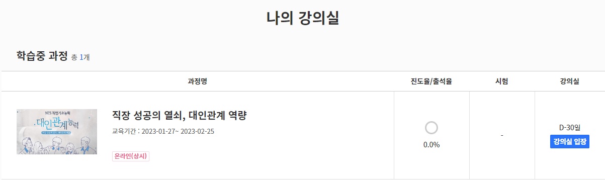 원한는 강의가 있다면 선택한 후, 오른쪽에 파란색 수강신청 버튼을 눌러줍니다. 수강신청이 완료되었다면 '나의 강의실'에 있는 강의실 입장 버튼을 눌러 동영상을 시청해주시면 됩니다. 실업인정일까지 동영상을 100프로 시청완료 해주시면 됩니다.