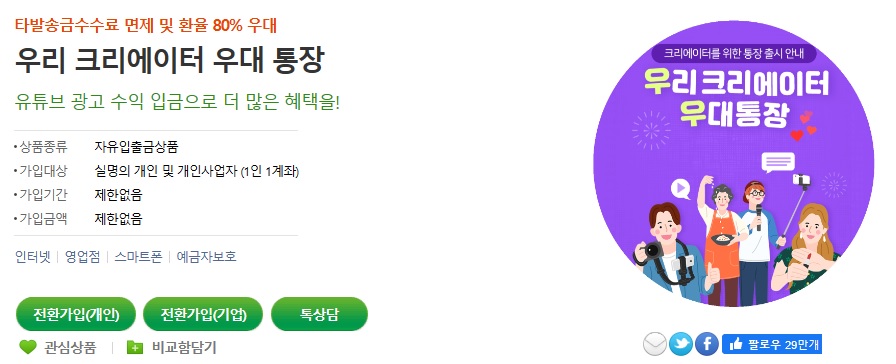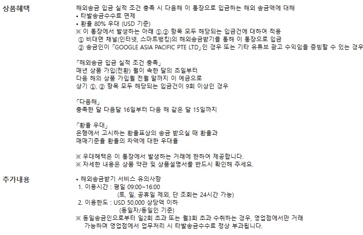우리은행에서 판매하고 있는 크리에이터 우대 통장은 해외송금 입금 실적 조건 충족 시에 타발 송금 수수료가 면제 된다고 합니다.
