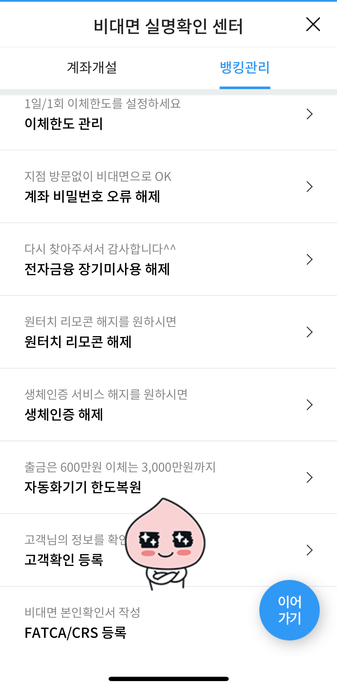 비대면 실명 확인을 클릭한 후 오른쪽에 있는 '뱅킹관리'를 클릭합니다. 그리고 스크롤을 밑으로 내려 아래쪽에 있는 '고객확인 등록'을 클릭합니다.