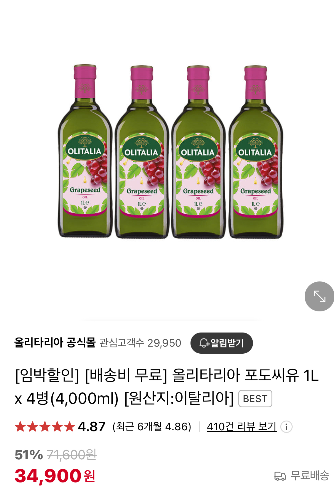 올리타리아는 이탈리아 세프들이 가장 선호하는 오일 브랜드라고 합니다. 사이트에 들어가보니 포도씨유 1L 4병을 임박할인가로 34,900원에 판매하고 있었습니다. 무료배송이니 1병당 8,725원 꼴입니다.