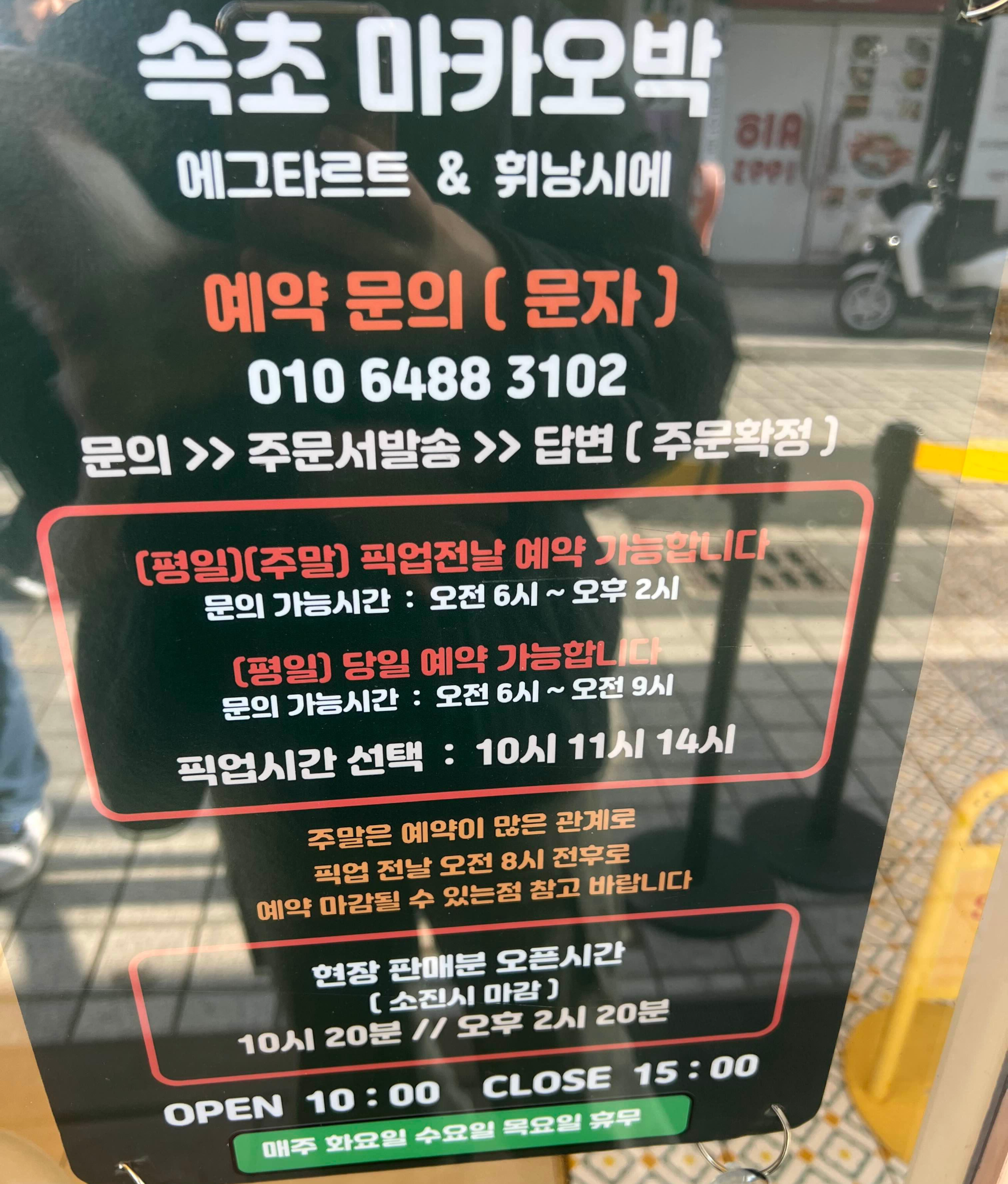 속초 마카오박의 예약시스템은 사장님께 예약문자를 남기면 되는데 먼저 순서가 있습니다! 먼저 사장님께 문의를 하면 사장님꼐서 주문서를 발송해주시고 주문서를 보내면 주문이 확정된거라고 합니다 ! 픽업 전날에 오전 6시부터 오후2시까지 픽업예약이 가능하다고 하니 참고하세요. 주말에는 예약이 많아서 픽업 전날 오전 8시 전후로 예약 마감될 수 있다고 하니 마음 편히새벽 6시에 일어나는 걸로 ..